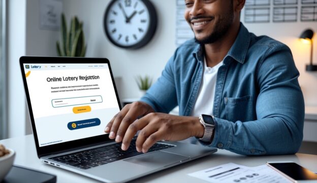 Seorang dewasa muda menggunakan laptop di ruang kerja yang terang dan rapi dengan elemen simbolik terkait lotere online dan transaksi cepat di meja.
