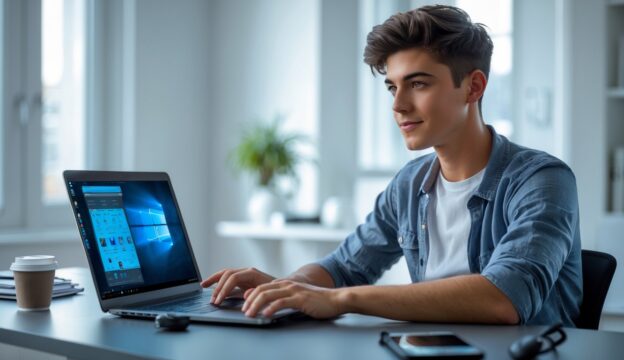 Seorang pria muda duduk di meja dengan laptop, fokus menggunakan perangkat di ruang kerja yang rapi dan terang.